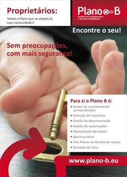 Devido às dificuldades de acesso ao crédito, a procura de casas para arrendar tem registado um aumento significativo. Este é o momento ideal para os proprietários de imóveis darem o passo de colocar para arrendar o seu espaço mas de forma segura. Através dos Planos de Gestão Plano B, os proprietários irão rentabilizar o património imobiliário com a mínima preocupação na questão de incumprimento por parte dos inquilinos. Cada proprietário poderá decidir qual dos quatro Planos de Gestão - Plano Basic, Plano Standard, Plano Premium e Plano Férias - mais se adequa à satisfação das suas necessidades específicas. Por entre os serviços disponibilizados destacam-se, de forma complementar, a Gestão de Arrendamento Personalizado, Seleção de Inquilinos, Gestão de Documentação, Gestão de Reclamação, Manutenção do Imóvel ou Apoio Jurídico. Única no mercado, a marca oferece ainda aos proprietários as três primeiras avenças, o que lhes irá permitir um maior desafogo financeiro enquanto faz a aposta mais segura.